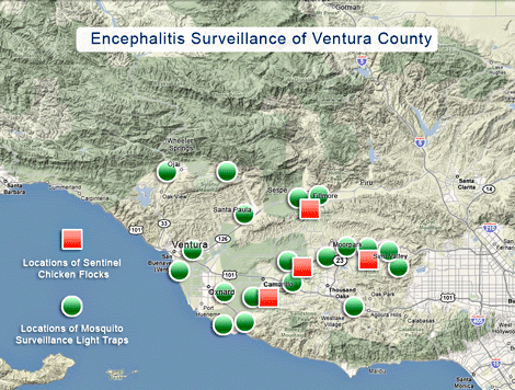 The Ventura County Arbovirus Surveillance Program was initiated in 1985 after an unprecedented 27 cases of SLE occurred in four Southern California counties during 1984. An extensive survey performed in Ventura County showed that all encephalitis vector mosquitoes, especially Culex tarsalis, were found countywide, but no evidence of SLE or WEE was documented at that time.