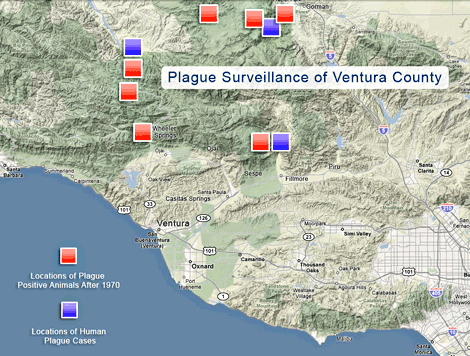 Exposure to plague is possible throughout Ventura County. The major threat of plague to humans is in the rural and the suburban foothills of the county. Diseased animals have been detected in the Santa Monica mountains, foothills north of Fillmore, Ojai, Lockwood Valley, and the Mt. Pinos-Frazier Mountain area.