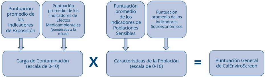 CalEnviroScreen calcula una puntuación percentil general por cada distrito censal basándose en dos categorías de puntuación: “Cargas de Contaminación” y “Características de la Población”. La Tabla 1 muestra las cuatro categorías de datos (21 indicadores) que se recopilan y se incluyen en CalEnviroScreen.