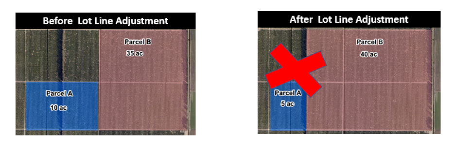 Parcel A transfers 5 acres to Parcel B, Parcel B becomes 40 acres