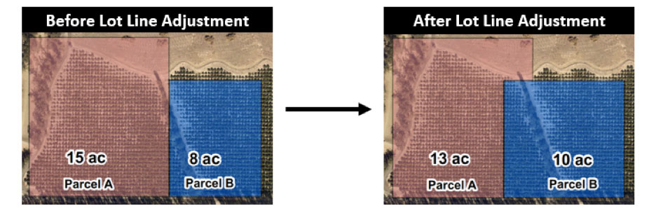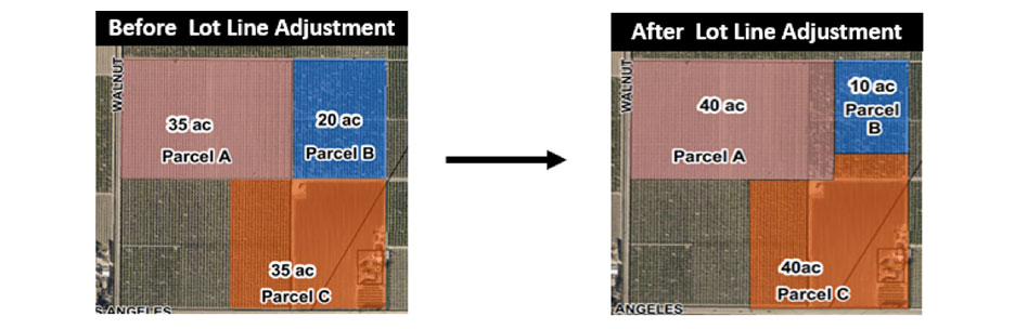 A LLA is a boundary line adjustment between four or fewer existing adjoining parcels where the land taken from one parcel is added to an adjoining parcel and where a greater number of parcels than originally existed is not thereby created. The approval of LLA applications and subsequent review and approval of deeds are ministerial acts that are not subject to the California Environmental Quality Act (CEQA). In instances where a LLA is requested in conjunction with a project involving an application for a conditional use permit, planned development permit, or other discretionary land use approval involving some or all of the property subject to the LLA, the LLA application shall be processed concurrently with the application for the discretionary land use approval, including for purposes of evaluating the project’s potential environmental effects. The application, filing, and processing requirements for a ministerial LLA are located in Section 8209 of the Ventura County Subdivision Ordinance. The Planning Division recommends that applicants for LLA applications schedule a pre-submittal meeting to review the application materials and required fees at: https://vcrma.org/divisions/planning/make-a-counter-appointment/. The Public Counter staff can also be reached by email at plan.counter@ventura.org or by phone at 805-654-2488.