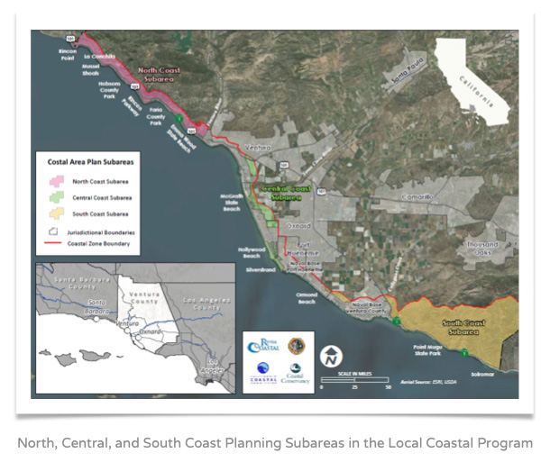 Ventura County is working in collaboration with community stakeholders to identify the impacts sea level rise will have on the County. The Ventura County Planning Division, through the VC Resilient Coastal Adaptation Project, is planning for sea level rise in the unincorporated areas which includes the 29 miles of coastline shown in the map below. Sea level rise will not have the same effect everywhere. For example, in unincorporated Ventura County, the mountainous coastal areas on the North and South Coast (red and yellow-colored areas on the map below) fewer acres of land will be affected by sea level rise compared to the low lying, relatively flat Central Coast (green-colored areas on the map) on the Oxnard Plain.