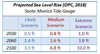 By the year 2100, the sea level is expected to rise between 3 feet to over 10 feet. The range reflects variations in future climate change emissions, ocean warming, and ice sheet loss (Parris et al. 2012). In the US, A 5-foot increase in water levels caused by sea level rise is estimated to affect 499,822 people, 644,143 acres, 209,737 homes, and $105.2 billion of property value in coastal areas across the United States (Climate Central, 2014). Sea level rise will not have the same effect everywhere around the world. Local sea level rise is measured using data collected by tide gauges. The Santa Monica tide gauge shows an average historical rate of sea level rise of about 1.5 mm per year, an average of about a half an inch per decade. Given the existing GHG emissions, the long-term time scale, and feedback mechanisms evaluated in the latest science, the rate of sea level rise is projected to accelerate in the future, resulting in an increasingly upward curve (see figure below).