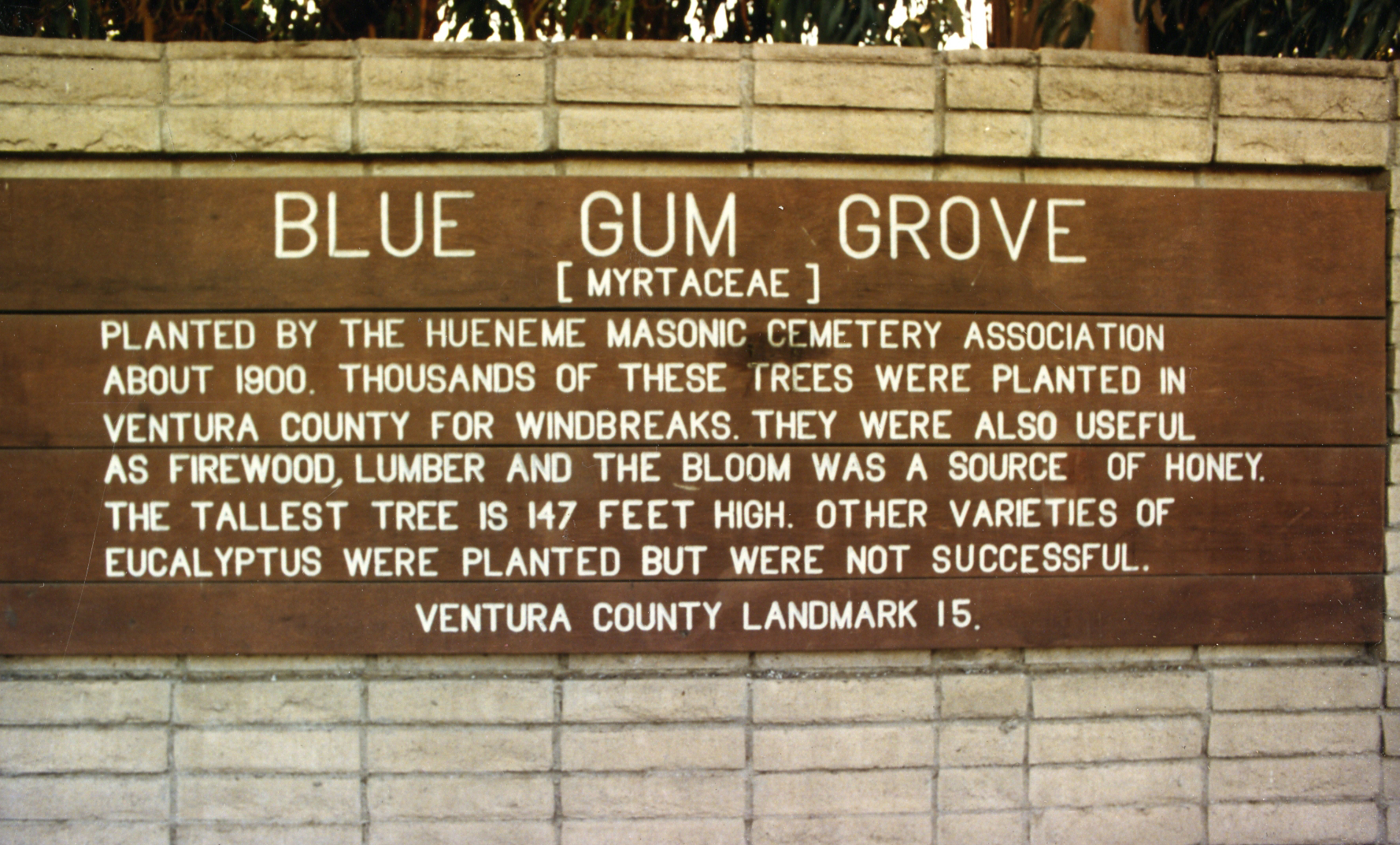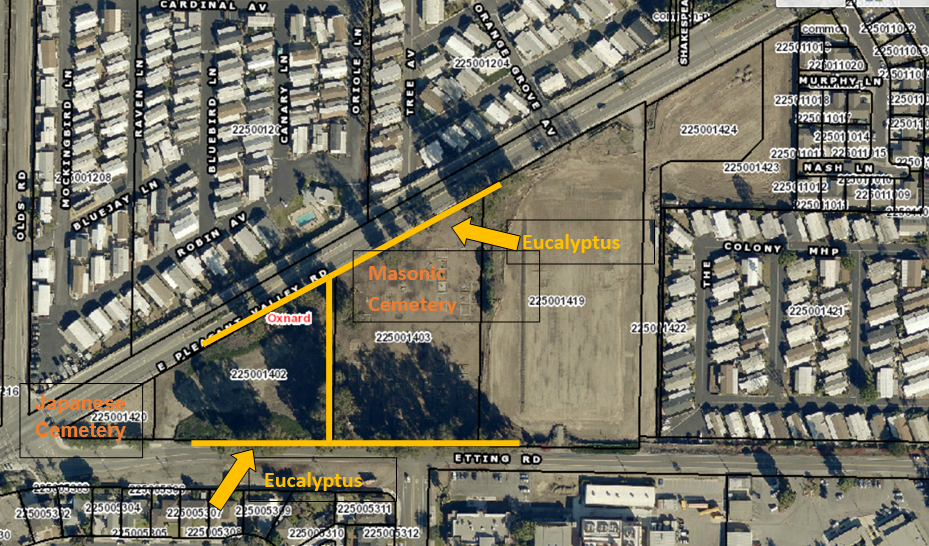The Naumann Eucalyptus Trees were originally a part of the Hueneme Masonic Cemetery established in 1898 by the Hueneme Masonic Cemetery Association (HMCA) to create a cemetery for members of the Hueneme Masonic Lodge and the surrounding community. This row of blue gum Eucalyptus trees (Eucalyptus globulus), approximately 1,300 feet long, was planted by farming pioneer Gustav Naumann to act as a border and wind break for the Hueneme Masonic Cemetery. The row originally extended down Pleasant Valley Road for approximately 500 feet, turned south to Etting Road on the western side of the Masonic Cemetery, and continued along Etting Road for approximately 440 feet.