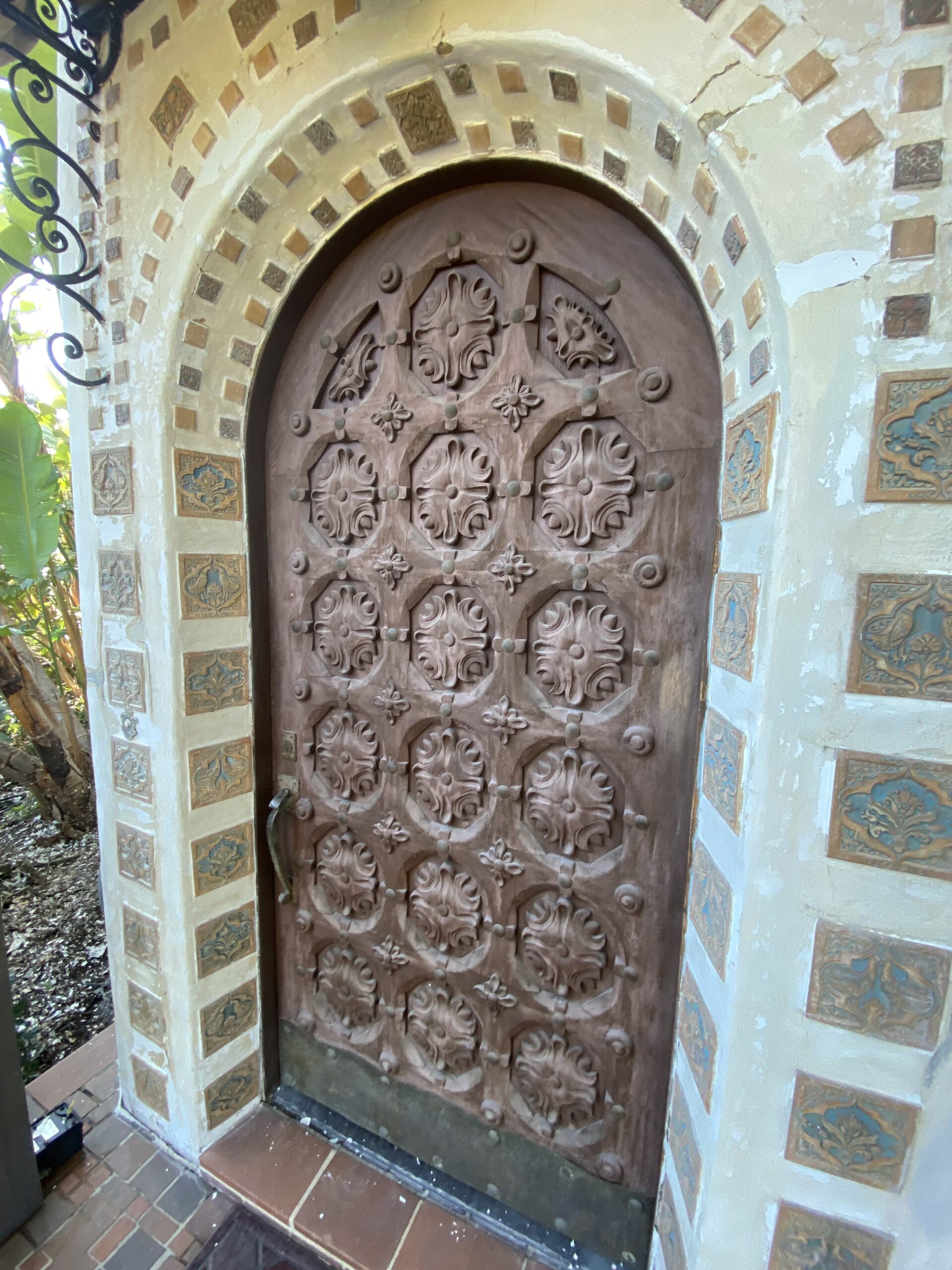 The main house is approximately 4,000 square feet with a dramatic entry way that features pink marble stairs, pillars, and stained-glass windows. The entrance ceiling is covered by hand applied gold leaf. The ceilings are coved, and all the doors are hand carved mahogany. (Mason, n.d.) The main entry consists of an inset arched front door set to the left of the front porch. The door is surrounded by Batchelder tiles of varying sizes set in a symmetrical pattern, with a wrought iron and amber stained-glass awning above the carved wooden door, which consists of floral designs. There is also a porch light that hangs at the center of the doorway. The two-story garage/guest house is also of the Spanish Colonial Revival style, with a tile roof and tile awning above the garage door, which has a multi window sectioned wooden door. The second-story bay has three ached windows that face the main house. (Fisher, 2010)