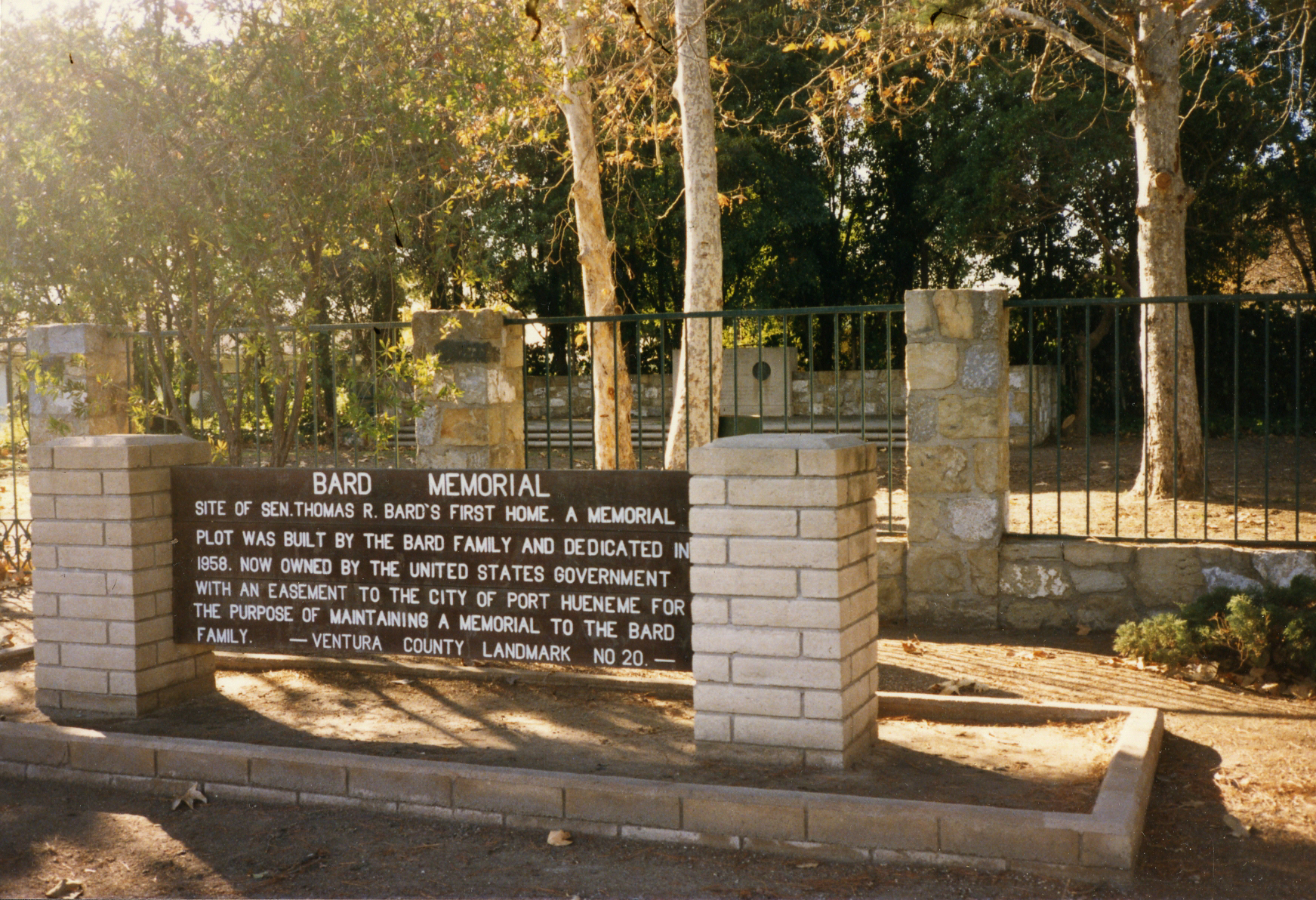 Memorialized here are Senator Thomas R. Bard, his wife Mary Gerberding Bard, and their son Robert Bard, who died in infancy. A low wall stretching across the back of the plot has the portraits in brass of Thomas R. Bard and his wife. The memorial is located on the former Bard Estate, now the property of the U.S. Navy. The City of Port Hueneme maintains an easement to the memorial.