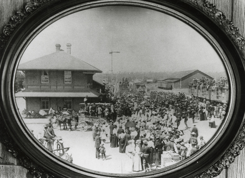 Residents of Santa Paula and the surrounding area eagerly gather at the new railroad station for the arrival of the first passenger train in 1887. Credit: Museum of Ventura County.