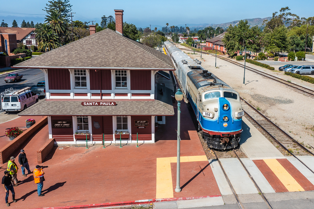 Santa Paula’s Southern Pacific Railroad Depot with a vintage blue and white train parked alongside, surrounded by a landscaped area and people walking nearby.