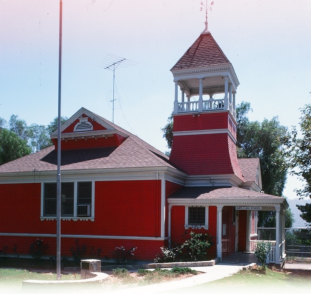 Santa Clara Schoolhouse, a vibrant red building with a tall, square tower, 1982.