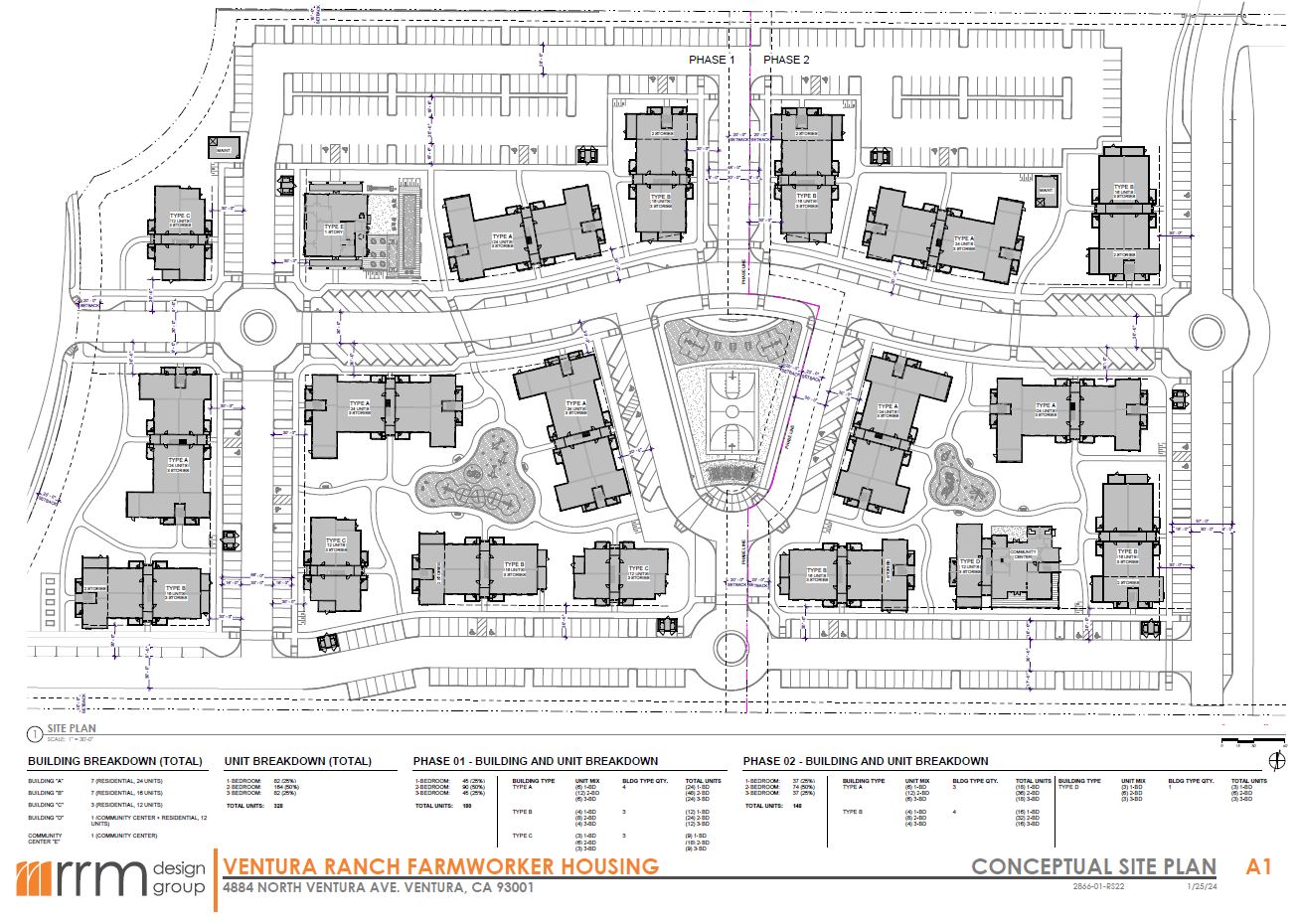 The proposed project also includes a community garden, a central basketball court with an outdoor recreation area, two playgrounds, outdoor picnic and barbecue areas, a corn hole court, and a bocce ball court. Circulation within the community would utilize two driveways off Ventura Avenue, and the connection to Floral Drive in the northwest corner will be for emergencies only, with a locked emergency access gate.